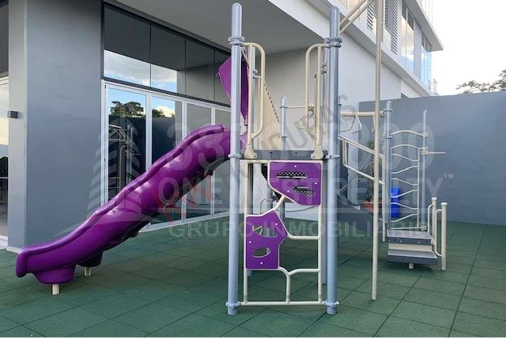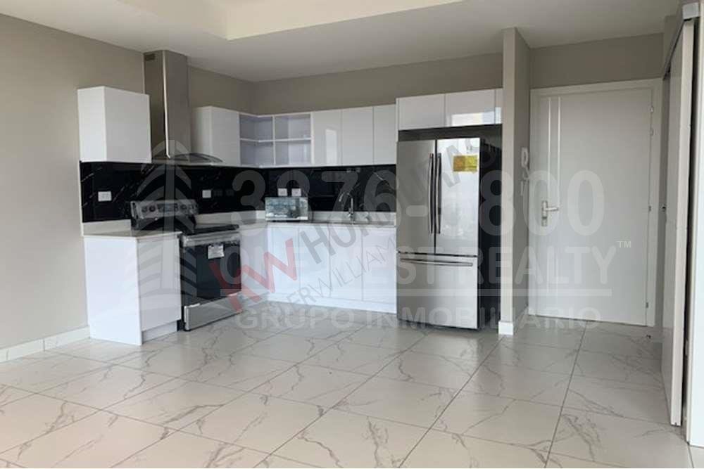 Área de sala con balcón, comedor, cocina, baño social y área de lavandería integrada, dormitorio principal con walk-in closet y baño privado y balcones con barandales de vidrio templado. El apartamento incluye Linea Blanca.