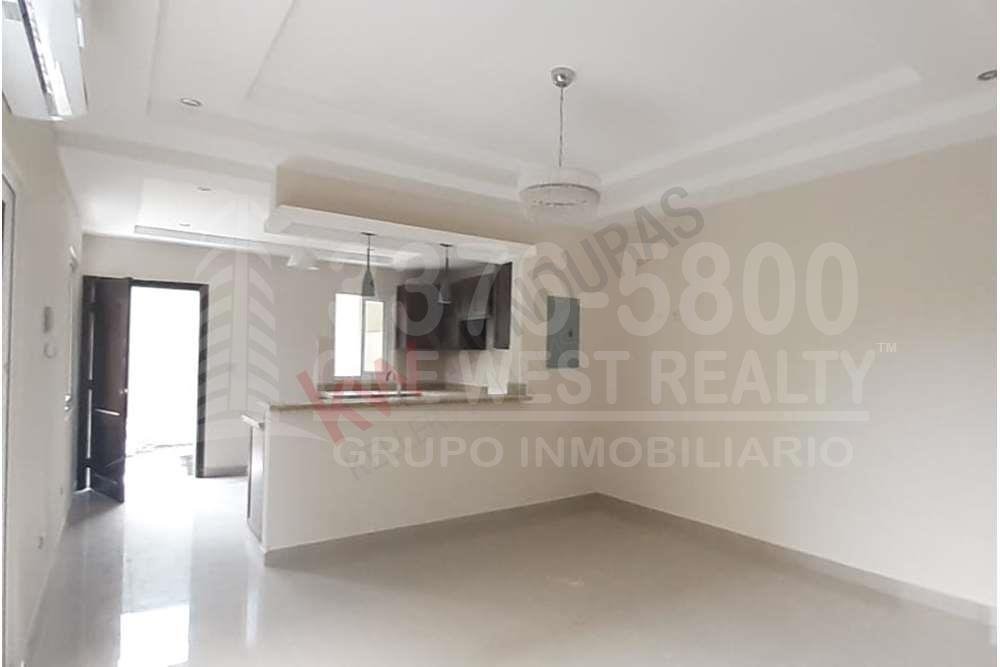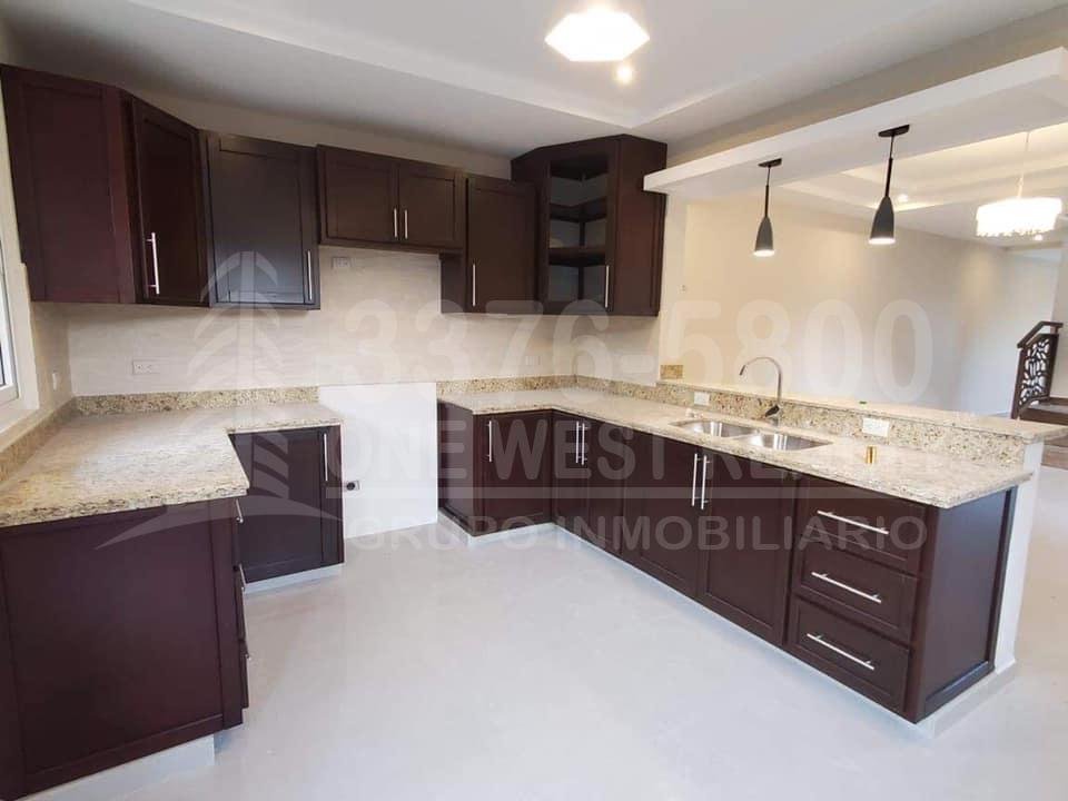 Primer nivel: Sala principal, medio baño, comedor con terraza exterior y pérgola, cocina con top de granito, barra de desayunador, también cuenta con área de lavandería y cisterna.
